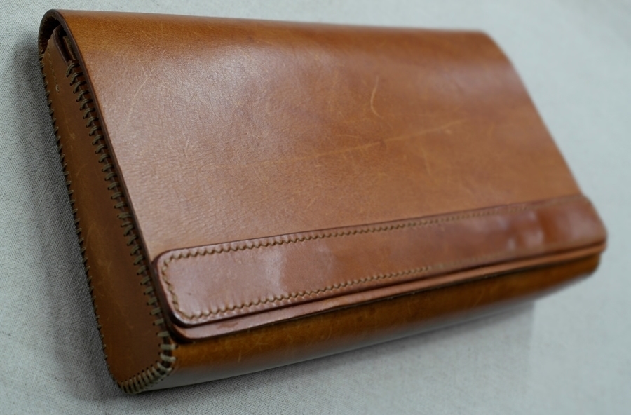 위 사진은 가죽 키링과 연밤색 가죽과 동일한 가죽으로 제작된 클러치이며 제작 후 2년이상 사용한 사진입니다