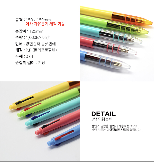 3색 볼펜이라 어디서든 편하게 3가지 색상으로 사용할 수 있는 볼펜이죠!