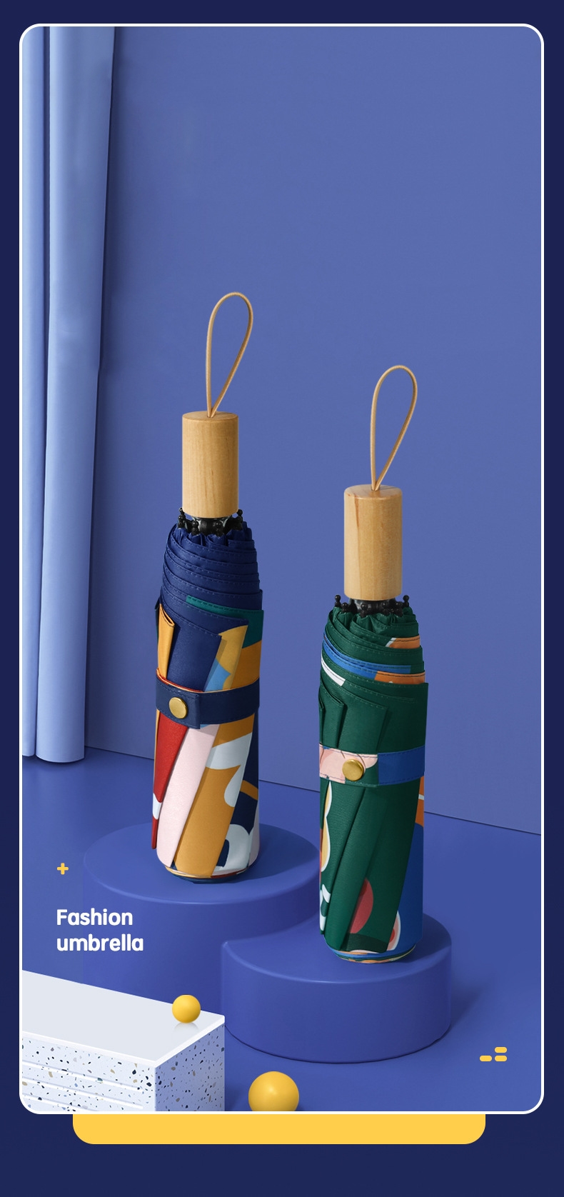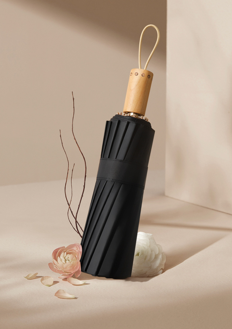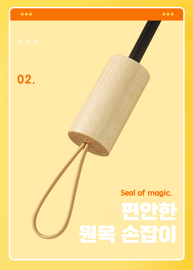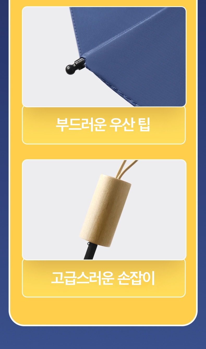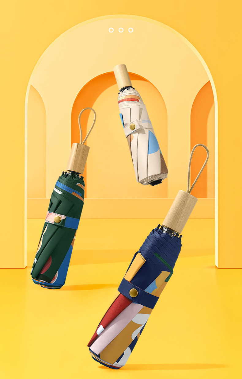 자외선 차단 효과와 뛰어난 내구성은 물론 매우 실용적 삼단 접이식 우산입니다. 느낌있는 목재 느낌의 손잡이와 선명한 컬러는 우산의 고급스러움과 산뜻함 더합니다.